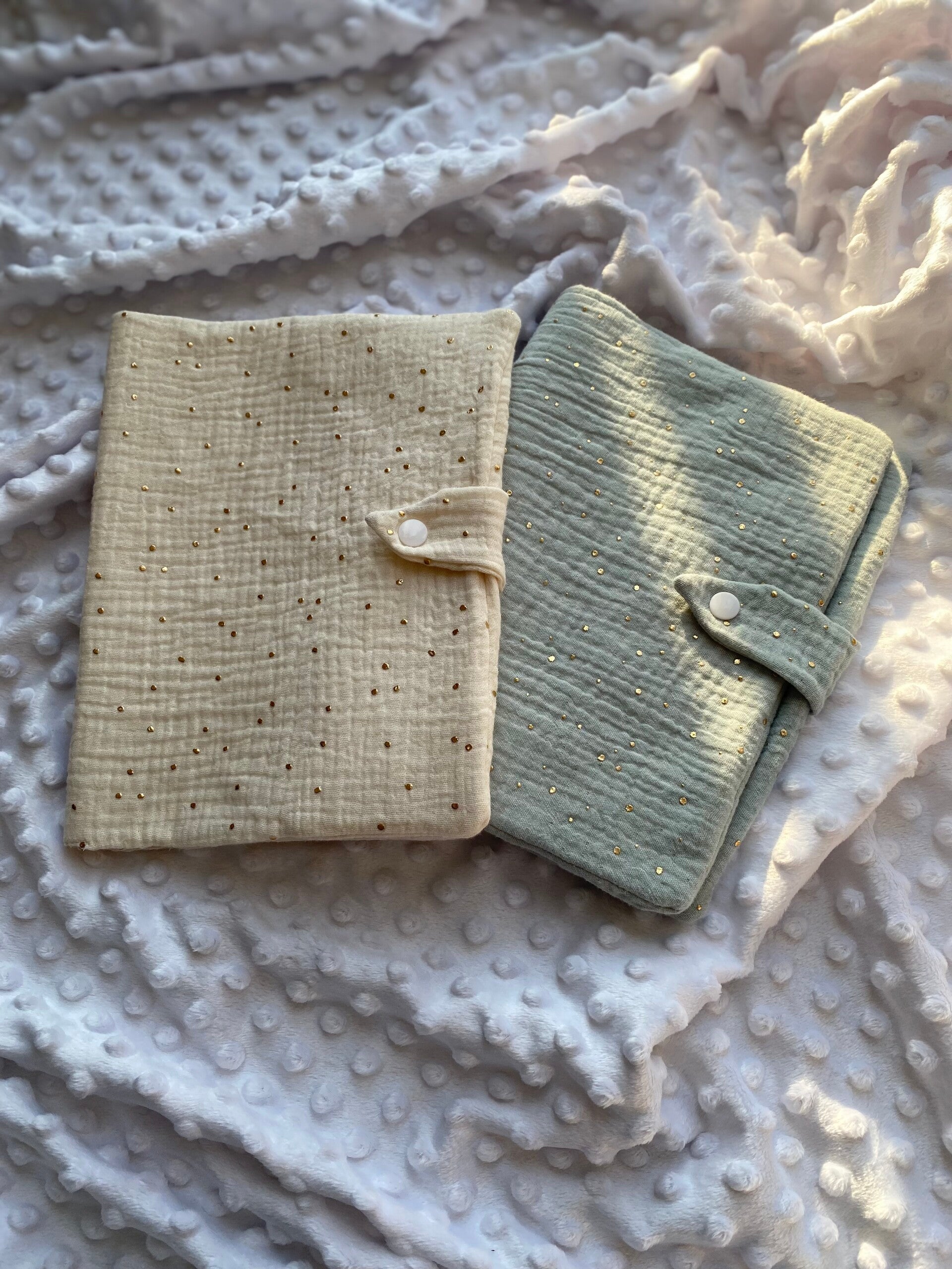 Un joli protège carnet de santé cousu main en double gaze de coton toute douce, parfait pour accompagner bébé dès ses premiers rendez-vous.
